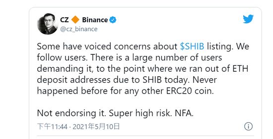 而币安创办人兼执行长赵长鹏也在推特上发文表示,这是币安史上首次发生储值地址供不应求的状况。他表示,币安了解部分用户对上架柴犬币的顾虑,币安一向是听从消费者意见的公司,而柴犬币的需求之庞大,甚至造成了币安首次发生以太坊主网储值地址不足的情况,这从来没有在任何代币中发生。