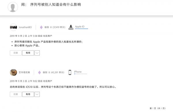 关于 SN 码泄露会造成何种影响,苹果中国社区上也有着相当多的讨论,但结果都是“没关系”、“无所谓”、“不影响”之类。苹果的 SN 码(序列号)是会印刷在产品包装外侧的,几乎是“公开透明”。(上文所公开的紫色 iPhone 12 的 SN 码就是一位 YouTuber 开箱时公开的。)
