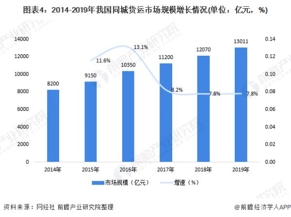 根据前瞻产业研究院整理的数据显示,近年来中国同城货运的市场规模一直保持快速增长的趋势,2019年市场规模达1.3万亿元,同比增长7.8%。