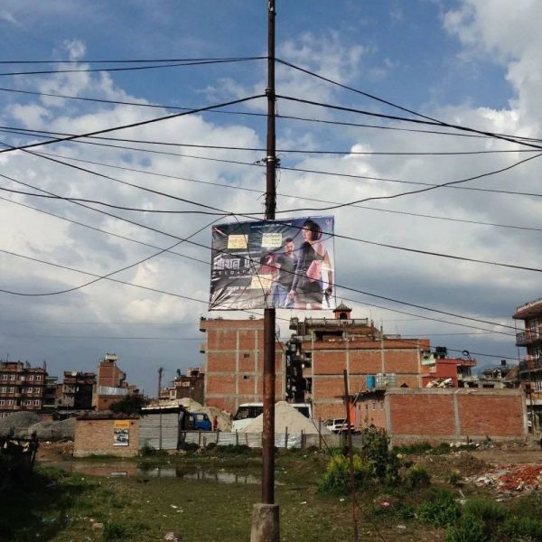 尼泊尔乡村一角,电线杆上悬挂电影海报。/ 家明