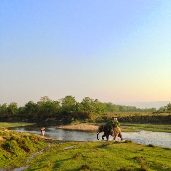 奇特旺国家公园吸引了大量外国游客前去探险徒步,图中两位游客正对着大象拍照。/家明