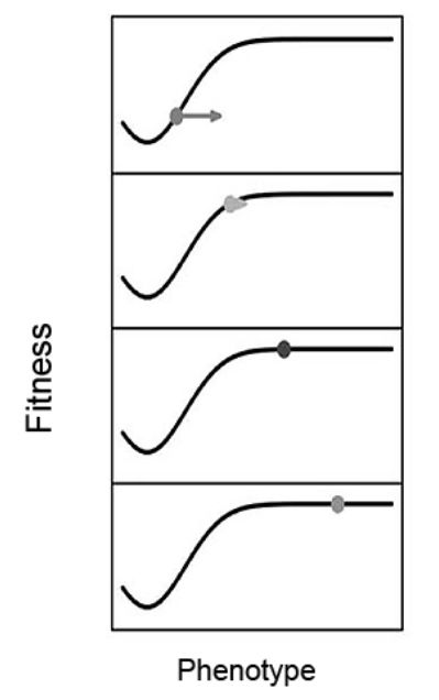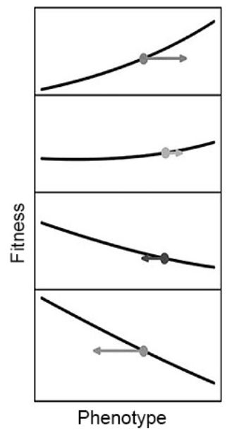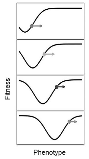图8. 适应性跷跷板,适应的方向因生物而改变。在图示中,时间向下移动。