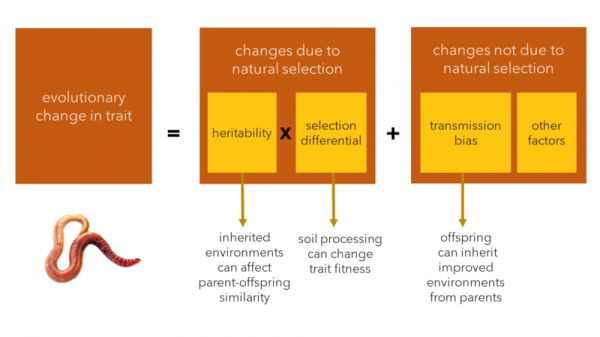 图7. 普莱斯方程模型模拟了自然选择(可以分解为两个组成部分:遗传力和选择差异)和非选择因素(如传递偏差)导致的演化变化。生态位的建设可以影响演化的所有三个组成部分,蚯蚓就是一个很好的例子。图片由作者提供