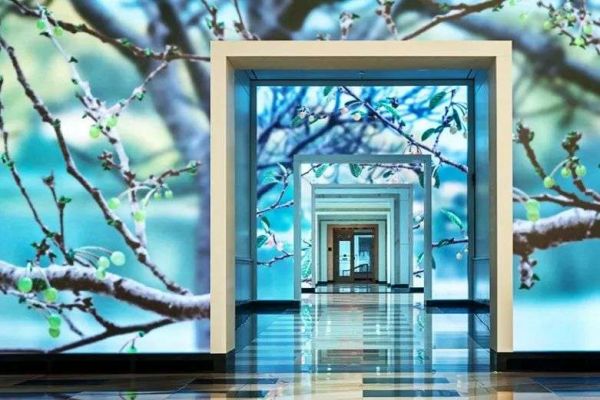 互动屏幕《季节》,春天,当人们从屏幕面前走过,樱桃树便开始开花