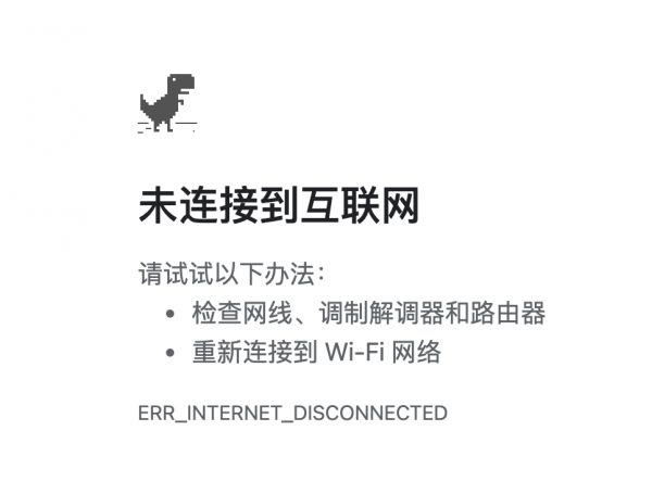 没错,这就是经典的 Chrome 浏览器「未连接互联网」页面,灰白小恐龙游戏相信大家也不陌生。