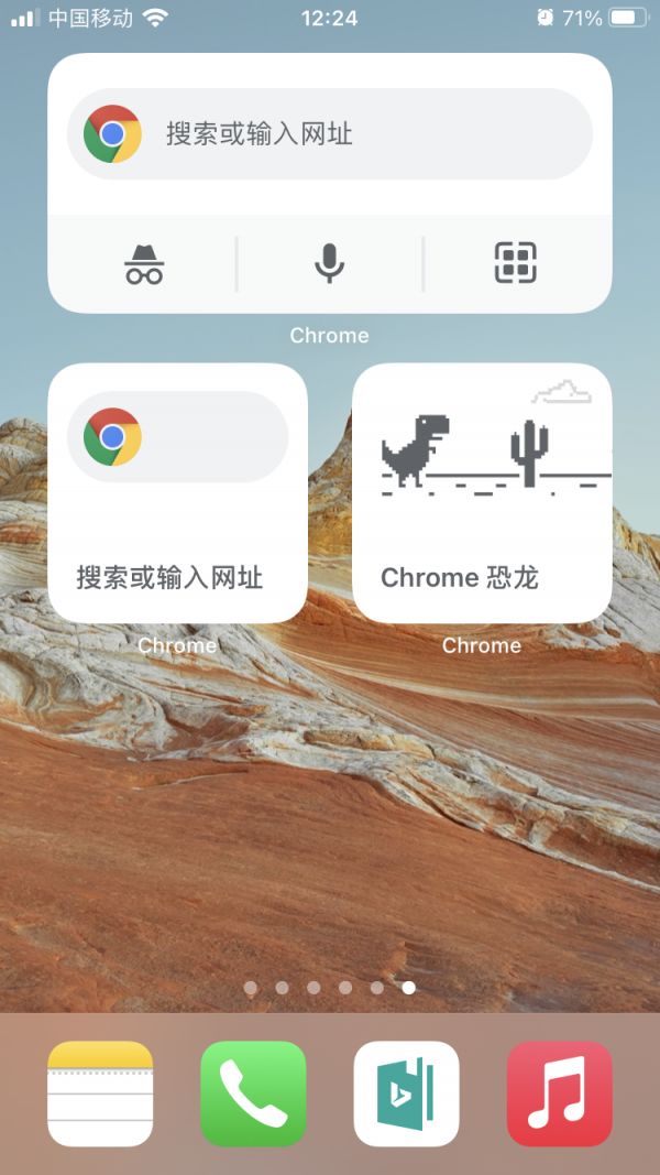 除了恐龙游戏小组件, Chrome 90 浏览器 iOS 版还更新了快速操作、搜索两个小组件。