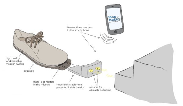据了解,这款鞋子名为InnoMake,每只鞋的鞋尖部分都装有防水的超声波传感器,最远可以检测到4米外的障碍物。