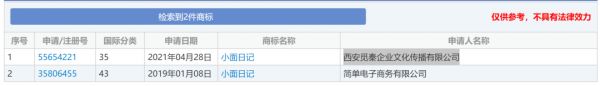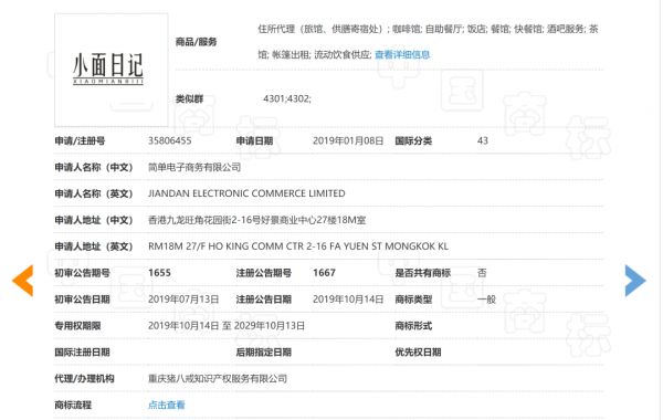 每经小编查询国家知识产权局商标局中国商标网,发现了两个名为“小面日记”的商标,一个是西安觅秦企业文化传播有限公司于今年4月10日申请,显示状态为正等待受理。另一个状态为已注册的“小面日记”商标,申请企业为简单电子商务有限公司,办理机构为重庆猪八戒知识产权服务有限公司,申请日期为2019年1月8日,有效期至2029年10月13日。