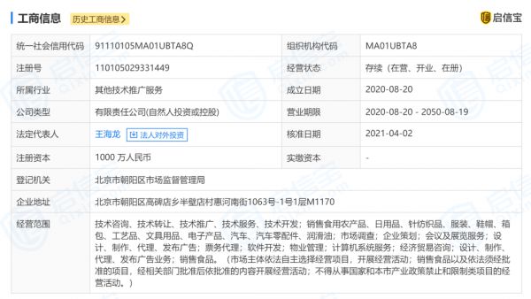 据启信宝,舌尖科技(北京)有限公司成立于2020年8月20日,注册资本为1000万元,其中自然人张英认缴金额800万元,王海龙认缴金额200万元,王海龙也是该公司的法定代表人。