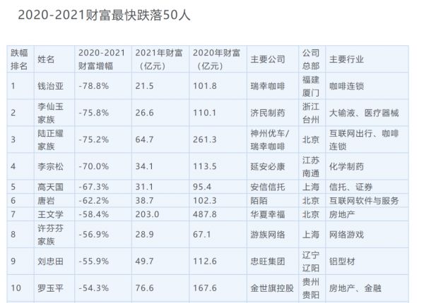 5月13日,据新财富发布的“2020-2021财富最快跌落50人”,前瑞幸咖啡CEO钱治亚财富缩水78.8%,成财富跌落最快的企业家,目前其财富规模为21.5亿。陆正耀家族的财富也在一年内缩水75.2%,目前为64.7亿元。