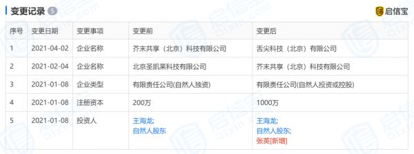 值得注意的是,据启信宝,前文提到的舌尖科技(北京)有限公司此前名为北京圣凯莱科技有限公司,今年2月4日更名为芥末共享科技有限公司,4月2日再次更名为舌尖科技。