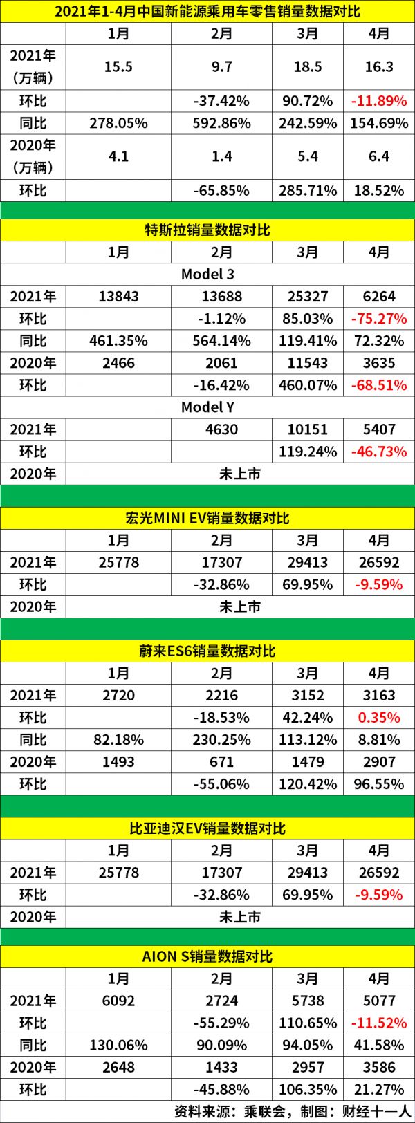 上图标红的环比数据显示,4月整个新能源车销量下滑11.89%,宏光MINI EV、比亚迪汉EV、广汽AION S这些代表车型的销量表现都和市场基本同步,下滑幅度在10个百分点左右,而蔚来ES6还逆市上扬,比3月多卖了11台车。