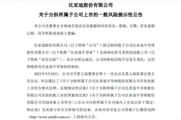 比亚迪在5月11日晚间发布了《关于分拆所属子公司比亚迪半导体有限公司至创业板上市的预案》(下称“公告”)。公告显示,比亚迪拟将控股子公司比亚迪半导体分拆至深交所创业板上市。值得注意的是,在本次分拆完成之后,比亚迪股份仍将维持对比亚迪半导体的控制权,股权结构也并不会发生变化。