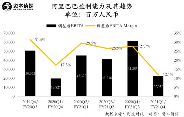 整体利润表现上,阿里巴巴第四财季经调整EBITA利润率为12%,低于去年同期17%的经调整EBITA利润率,也明显低于此前几个财季的经调整EBITA利润率。