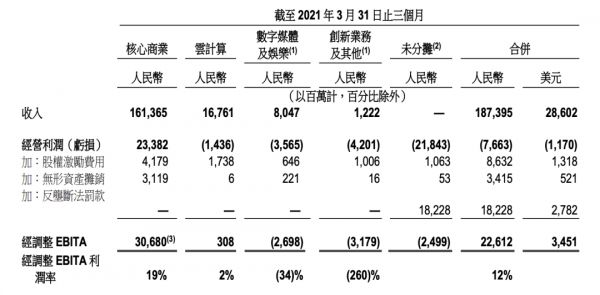 除了云计算业务,“数字媒体及娱乐”和“创新业务及其他”均处于亏损状态。前者第四财季实现收入80.47亿元,同比仅增12%,是阿里巴巴各分部业务中增速最缓的一项;后者第四财季实现收入12.22亿元,同比仅增18%,且经调整EBITA亏损率仍然较高。