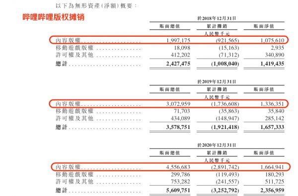 在OGV内容涉及的无形资产方面,包括内容版权、游戏版权和许可证,其中内容版权占比绝大多数,可将它近似视为无形资产总数。根据其招股书,内容版权经过摊销后的账面净值在2018年末、2019年末、2020年末分别是10.8亿、13.4亿、16.6亿元。由于有UP主作为内容供应根基,B站在版权布局上采取的是比较温和的策略,与长视频有所区别。
