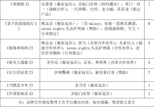 依据表格,在品牌合作数量上,《向往的生活5》凭借10个品牌合作一骑绝尘,《极限挑战7》《奔跑吧5》《妻子的浪漫旅行5》《婆婆和妈妈2》分别以一个品牌的间隔差彼此紧随,《当燃是少年2》《中国新相亲4》垫底,都仅有一个独家冠名。