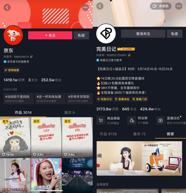 左为京东现有抖音账号主页 右为完美日记抖音蓝V店主页