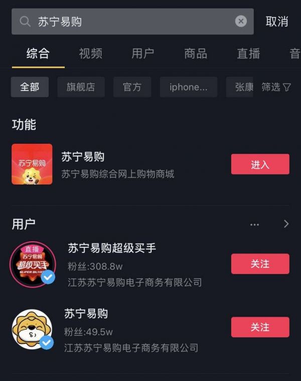 上为苏宁易购抖音小程序 中为苏宁易购超级买手抖音号