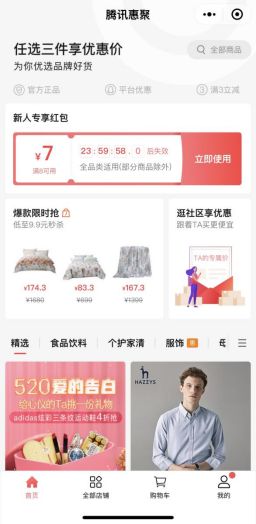 与腾讯曾推出的其他电商玩法不同,惠聚被定义为“腾讯广告的社交电商实践解决方案”。惠聚将商家购买流量的费用用以补贴平台用户,放到社群进行传播,用更低的成本获取用户,帮助商家“私域增长”。未来惠聚还会引入拼团优惠、品牌直播、拉人领红包等互动新玩法。
