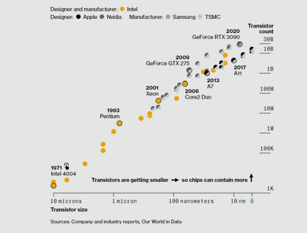 芯片公司设法将更多的晶体管封装到芯片里面,好提高性能以及提高设备的电源效率。1971年,英特尔推出了第一款微处理器4004,里面仅包含2300个晶体管,每个的尺寸为10微米,也就是十万分之一米。在接下来几十年的时间里,英特尔一直处于无可争议的领导地位,但到了2015年至2020年间,英特尔被赶下了王座,因为竞争对手台积电和三星电子制造出了有着更好的晶体管的芯片:这些晶体管的尺寸最小只有5纳米,也就是50亿分之一米(相比之下,人的头发平均宽度是100000纳米。)