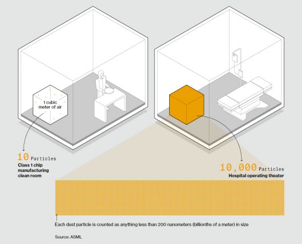 在把硅放进芯片制造机器之前,你需要一间无尘室。一间非常干净的房间。单个晶体管比病毒小很多倍。仅有一小点灰尘会造成严重破坏,并浪费数百万美元的精力。为了减轻这种风险,芯片制造商将其机器安置在基本上没有灰尘的房间中。