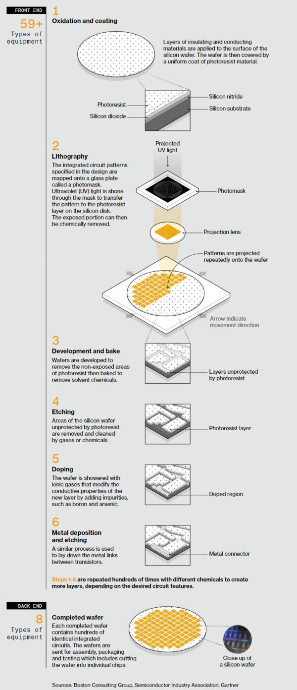 芯片由多达100层的材料组成。要先堆积,然后部分去除,从而形成把所有晶体管连接起来的复杂三维结构。有些层的厚度只有一个原子。由应用材料、泛林集团以及东京电子制造的机器需要处理很多的变量,比方说温度、压力以及电场与磁场,之后才能把东西做出来。