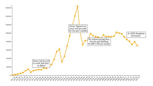 Henry Zhu 从 Adobe 辞职,开始了在 Babel 的全职工作。到了 2019 年 11 月,Babel 已经成功支付了 Henry Zhu 一年多的薪水(每月 11000 美元),并开始向其他三位兼职成员支付薪水,分别是 Jùnliàng、Kai 和 Nicolò,最初每月 2000 美元。并且,Babel 还希望后期增加预算,将三位兼职成员转为全职。