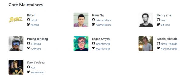 从 Babel 官网可见,该项目当前有 6 名核心维护者,包括 Brian Ng、Henry Zhu 等,这个小团队承担了 Babel 的维护工作。
