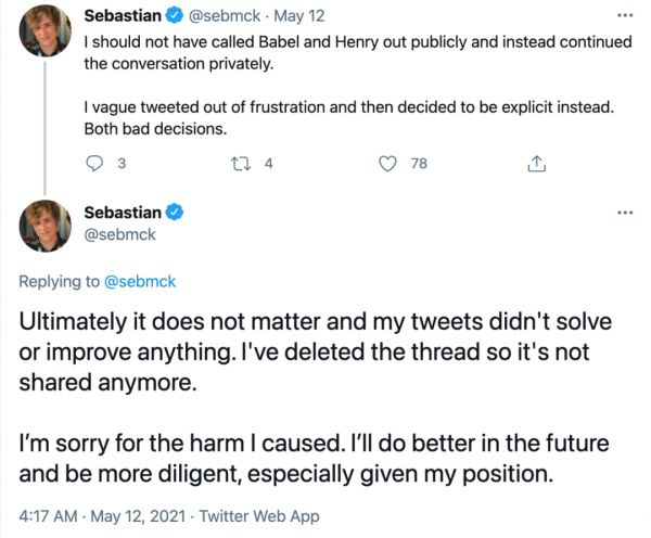 但 Sebastian McKenzie 随后删除了推文,并对自己造成的影响感到抱歉。