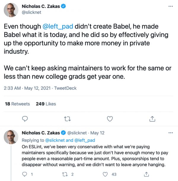 同时,Nicholas C. Zakas 也坦承,开源项目运转不易:「在 ESLint,我们一直为维护者提供的薪资都是比较保守的,因为没有太多的钱来支付劳务费用。赞助商常常突然消失,我们也不想让任何人失业。」