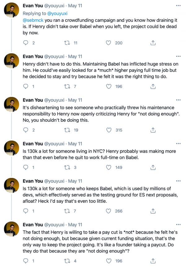 项目资金紧张,归责于某个人,合理吗?面对 McKenzie 对 Henry Zhu 的指责,包括尤雨溪(Evan You)在内的独立开发者都出面声援。