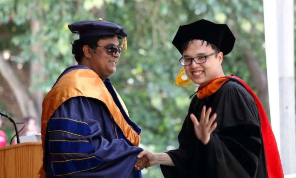 图注:2016年斯坦福博士毕业典礼,朱晨光与导师Balaji Prabhakar合影