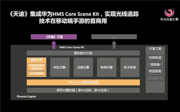 据悉,凤凰引擎是华为公布的全新光线追踪技术,可以让手游实现光线追踪效果。包括跨平台图形层(多API、多OS)、GPU TurboX加速层、渲染引擎(混合管线)、材质引擎、动画引擎、物理引擎、粒子系统等。