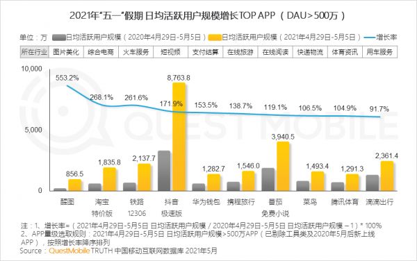 QuestMobile发布的2021“五一”假期经济洞察报告指出,淘宝特价版、抖音极速版日均DAU增长了一倍以上。其中,抖音极速版凭借8763.8万人的日活规模,霸榜同时段(4.29-5.5)第一,增长率达到171.9%,同样举行了红包活动的快手极速版增长率却未排进前十。
