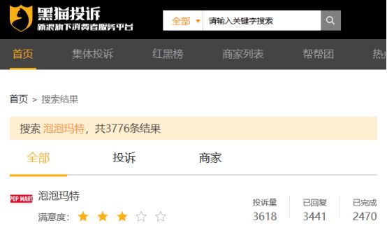 根据黑猫投诉,泡泡玛特投诉量达到3618条,其中内容多为“物品瑕疵”、“货不对版、卡片与实物不符”,其中单搜索“Skullpanda”也能找到“存在瑕疵”、“拦截不发货”等问题。