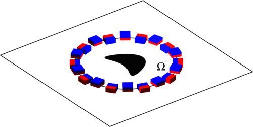 这幅示意图展示了借助围绕排列的帕尔贴元件(图中红蓝相间),能够将一个二维平面区域Ω中的风筝(图中黑色)在热测量中“隐形”。| 图片来源:Cassier, M. et al.