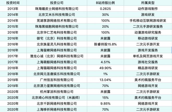 2020年到2021年,B站投资游戏的动作集中在两个阶段,一是2020年后半年,B站对一众二次元游戏进行了投资。