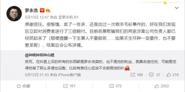 13日,罗永浩本人转发并回复表示“感谢信任。很惭愧,卖了一年多,还是出过一次假羊毛衫事件的,好在我们发现后立即对消费者进行了三倍赔付。目前恶意欺骗我们的两家涉案公司负责人都已经抓起来了(顺便提醒一下生意人不要作恶……如果天生坏种一定要作,也不要惹龙哥),结案后会公布详情。”