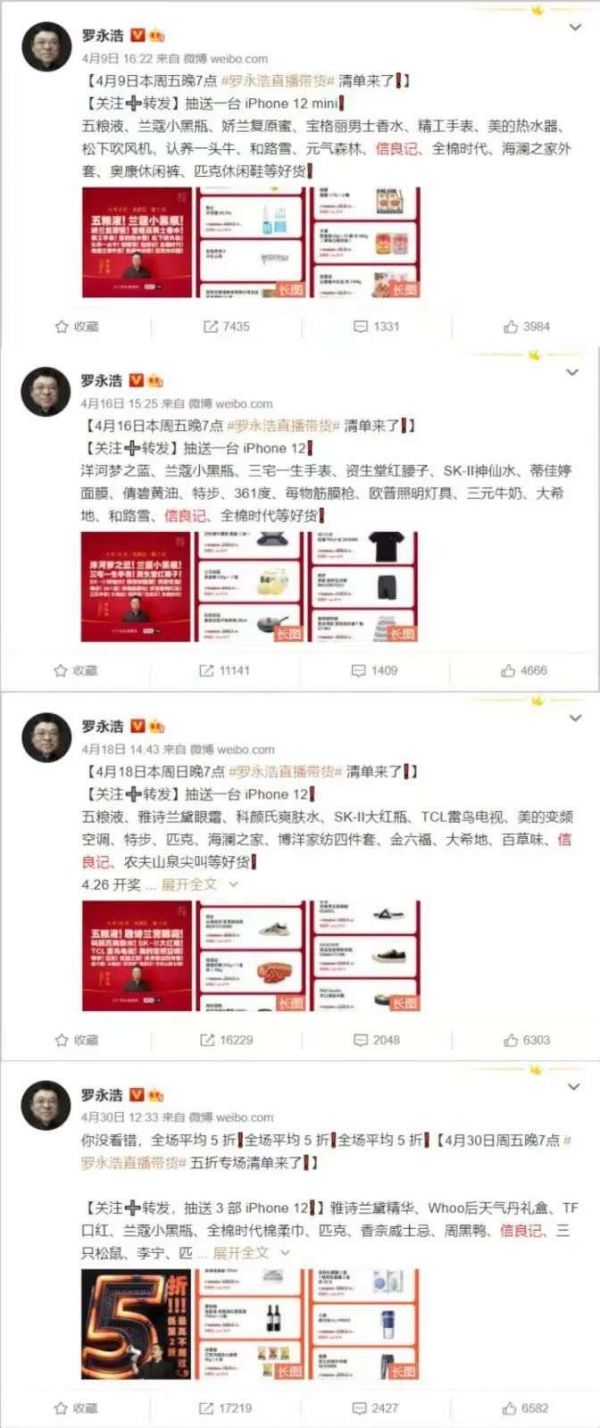 尽管如此,信良记仍是罗永浩直播间的常客,2020年4月的信良记4次出现在罗永浩的直播预告清单中。