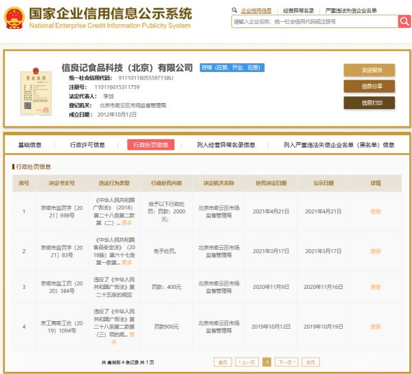 值得注意的是,信良记小龙虾所属的信良记食品科技(北京)有限公司屡遭行政处罚。