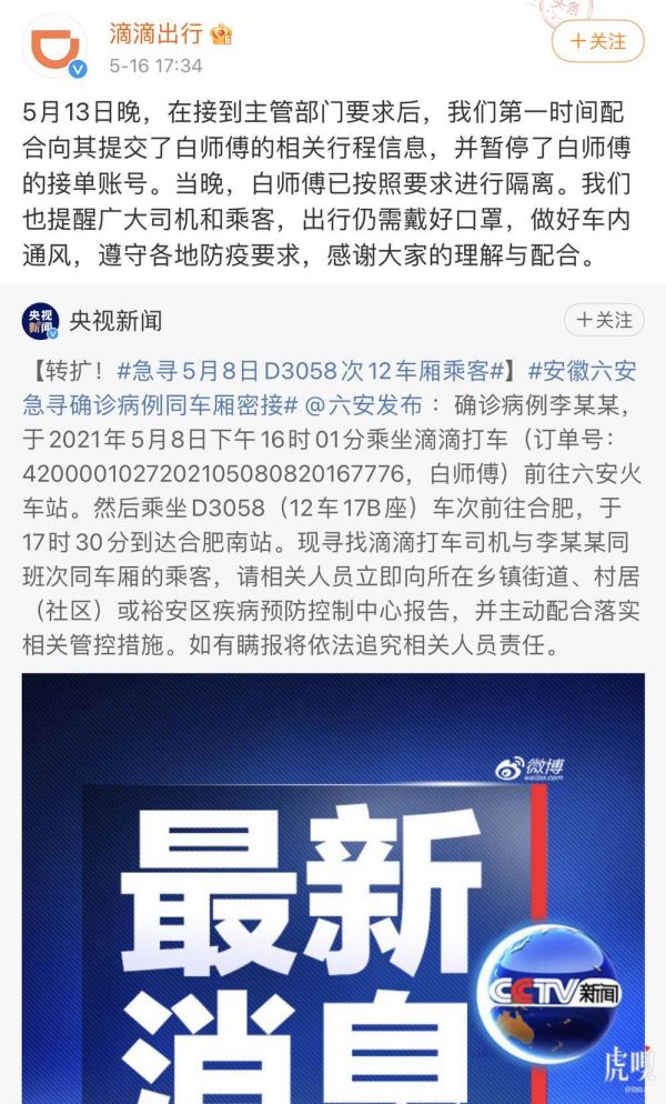@澎湃【滴滴回应“六安一司机被列为确诊病例密接者”:已暂停其接单】针对“六安市排查追踪一确诊病例的密接者中涉及一名滴滴司机”一事,5月16日,滴滴出行官方微博回应称,5月13日晚,在接到主管部门要求后,滴滴第一时间配合提交了涉及司机白师傅的相关行程信息,并暂停了白师傅的接单账号。当晚,白师傅已按照要求进行隔离。