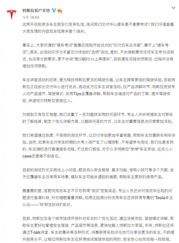 @新浪科技【特斯拉回应“提车考试”:系“选修”活动,提车未增加限制】针对特斯拉“提车考试”一事,特斯拉方面回应称,所谓的“提车考试”是最近刚刚开始试点的“交付日车主讲堂”,算不上“提车考试”;此活动仅作为丰富交付体验的“选修”活动。特斯拉表示,不会强制要求任何车主参与该测试,也没有分数要求,更不会说“建议80分以上再提车”,目前提车流程依然照旧,过程中没有增加任何限制。此前,一名特斯拉车主及视频博主爆料称,近期国内特斯拉新车交付将新增考试环节。不过,该考试并非强制执行,车主可自愿参加。爆料称特斯拉建议达到一定成绩后再进行车辆交付与使用。据爆料,通过考试后的车主将获得名为“特新生”认证,即车辆初体验测试。交付人员建议考试成绩超过80分后再提车。