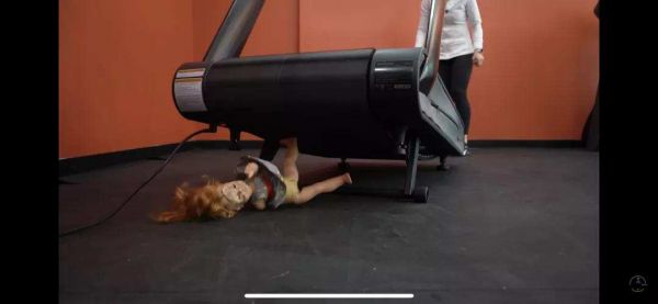 5.而如果儿童不幸在快速运行的跑步机上跌落,则会被强力卷进跑步机下面,然后必然受伤。博主拿了一个娃娃做实验,娃娃在跑步机尾部,一接触到跑步机立马被卷到底部,并且被强力压到变形。