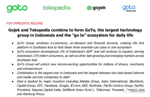 传言多时的印尼估值最大的两家互联网独角兽Gojek和Tokopedia的合并终于迎来了官宣。今天两家正式发布新闻稿,成立了GoTo集团。