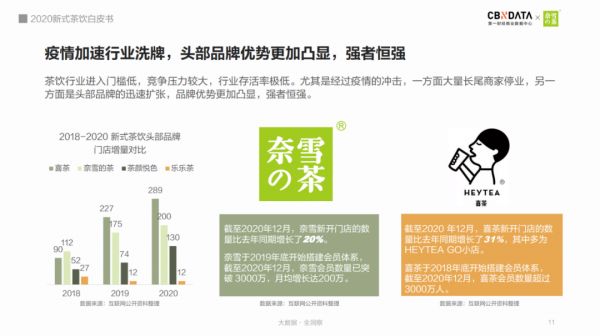 2020年新冠肺炎疫情成为新式茶饮行业的重要拐点,市场热度再度攀升,也加速了行业洗牌,头部品牌的优势愈发凸显。根据CBNData《2020新式茶饮白皮书》显示,截至去年12月,喜茶、奈雪的茶新开门店数量比去年同期分别增长了31%、20%,会员数量双双突破3000万人。
