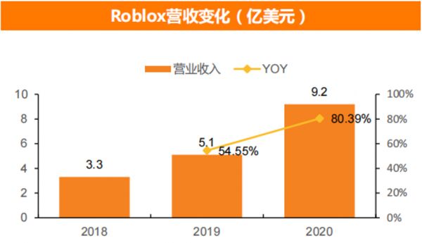 近三年,Roblox的营收保持快速增长的势头。2020年Roblox的营收为9.24亿美元,同比增长80.39%,远高于去年同期56%的增速。