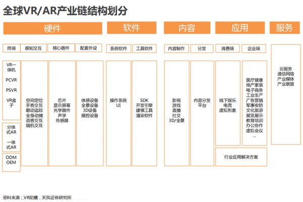 从硬件端向上延伸,虚拟设备产业链又可以分为硬件、软件、内容、应用以及服务五大块。其中每一条细分赛道,其实都可能跑出估值不菲的独角兽公司。