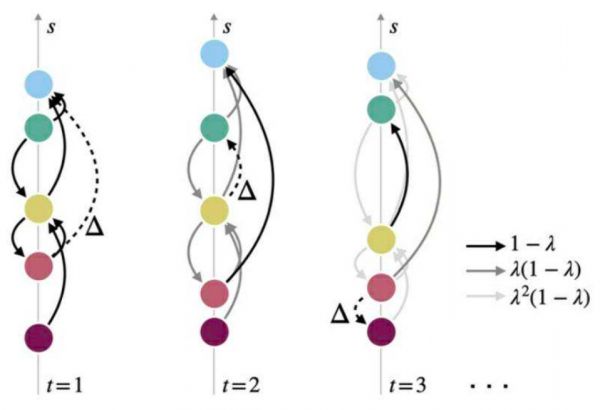 图3是该研究提出的“获胜”动力学与等级演变示意图,反映了5个节点在时间范围内等级的相对变化情况。横轴t代表不同时刻,纵轴s代表等级评分,在纵轴的位置越高意味着等级越高。虚线Δ代表t时刻下新产生的获胜关系。实线代表已存在的获胜经历,而不同深浅色的实线则反映时间变化情况下获胜关系的衰减情况。颜色越浅代表该获胜关系越“被遗忘”,或是不再那么重要。