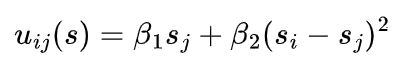 其中一般假设β1>0和β2<0。参数β1捕获了“威望偏好”,β1值为正表示倾向于认可高分者。参数β2反映为“接近偏好”,β2值为负值,表明倾向于认可与自己得分相近的他人。最后获胜关系i→j产生的概率为可由多项Logit表示: